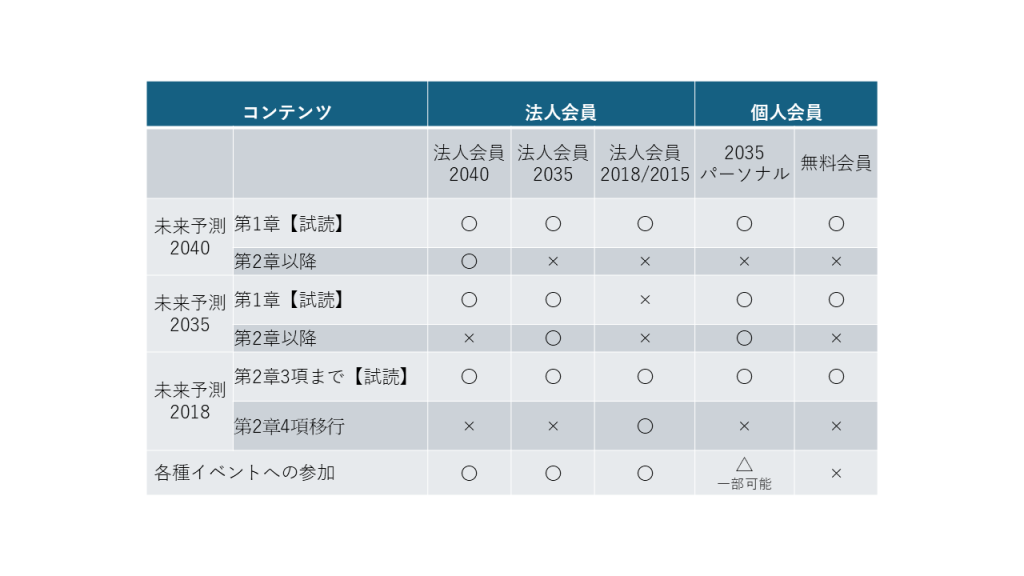 個人で「未来予測2035」の閲覧を希望されるお客様は「未来予測2035パーソナル」へのご入会を検討ください。